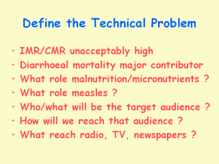 complicated by malnutrition. Naturally, if this is defined as the major health problem in an area, the more one knows about community dynamics, the more likely it is that one can target those most likely to be able to change the situation – the intended audience. Also, the method one uses to reach the intended audience can have a profound effect on the success of the project. Careful analysis of the audience and the different media to reach (and affect them), is essential. |