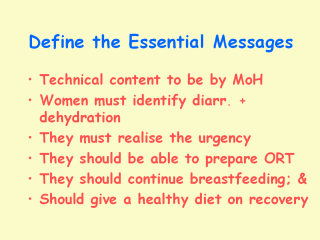 for any one intervention), was considered the optimum way to proceed. Most women that we spoke to were well able to define the signs of dehydration (fast, shallow breathing, sunken eyes, sunken fontanel, raging thirst, and inelastic skin when pinched). Not always was vomiting associated with dehydration. We were unable to establish what degree of urgency was attached to bouts of diarrhoea – beyond the panic that sets in when the baby goes comatose. It was thus assumed that emphasis should be placed on treating all cases of diarrhoea with urgency. Preparation of the ORT in the home proved challenging. First, the policy of Government was solely to promote the use of the ‘packet’. While this would give a good ratio of the ingredients if the volume of water to which it was added was accurate, no account was taken of the fact that 99% of women in Baluchestan couldn’t read the instructions on the (1 litre) packet; and there were in any event two other packets available – one for half-a-litre, and one for 125 ml. Obviously, this was a recipe for total confusion. We thus opted for the home solution after testing to see how women in the province would handle it; selecting the pinch-and-scoop method. The only real problem was finding a standard half-litre container to ensure that the ORT would be 1-1-1 (One pinch of salt; one scoop of sugar; and one measure of water). Luckily, nearly all homes had an aluminium ‘glass’ which was close to half-a-litre in size. Breastfeeding was the least challenging of all – it was virtually universally practised at the time. The healthy diet – or absence of one – was more a function of poverty than of knowledge. However, when its importance was stressed, correct feeding became a higher priority. |