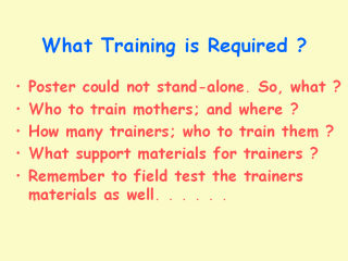 FHW. The training would be done in the clinics. While there were adequate numbers of FHWs to contact all mothers, because Baluchestan covers 43% of the land area of Pakistan, travelling to train all of them with a mobile team was impractical. Thus it was accepted that a small group of trainers would be trained and they would in turn train the FHWs. We proposed to train the trainers ourselves; and for the trainersto undertake the training of the FHWs – who in turn would train mothers in the clinics. An analysis of the needs for the trainers and FHWs showed that all they required was a flipchart with the 11 individual pictures on 11 sheets (of stiff card so it could stand by itself). On the reverse of the flipchart was a short bullet list of points needing to be made about each picture. The next slide shows how the flipchart works. The field test which was applied to the FHWs and trainers focussed on their ability to understand the pictures and to be able to read the text on the back of the flipchart. |