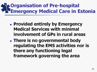 involvement of general practitioners in some rural areas. There is no governmental body regulating the EMS and the legal back-ground is very weak. |