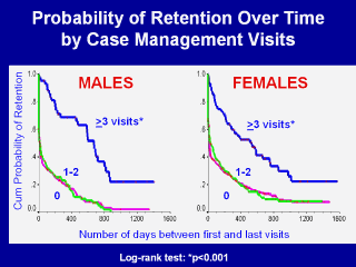 | The threshold for increased retention was slightly higher for case management services compared to outreach or MH services. In both gender groups, retention times were significantly longer among clients receiving case management 3 or more times, compared to those with fewer times. |