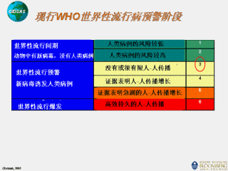 我们目前处于第3阶段:一种新亚型的流感病毒正在引起人体上的疾病,但并没有高效而持久的在人和人之间传播。