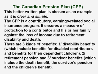 half of the contributions. If you are self-employed, you pay both portions. You do not make contributions if you are receiving a CPP disability or retirement pension. At age 70, you stop contributing even if you have not stopped working. The amount you pay is based on your salary. If you are self-employed, it is based on your net business income (after expenses). You do not contribute on any other source of income, such as investment earnings. If, during a year, you contributed too much or earned less than a set minimum amount, you will receive a refund of contributions when you complete your income tax return. You only pay contributions on your annual earnings between the minimum and a set maximum level (these are called your "pensionable" earnings). The minimum level is frozen at $3,500 Canadian dollars. The maximum level is adjusted each January, based on increases in the average wage. Your contributions are used to determine if you or your family are eligible for a benefit, and to calculate the monthly amount. Both the length of time and the amount of earnings on which you contribute (up to the maximum each year) are factors. Normally, the more you earn and contribute to the CPP over the years, the higher the benefit will be, because you will have built up a lot of CPP pension credits. |
