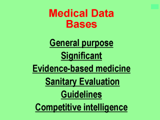 GENERAL PURPOSE: Wide information about biomedical sciences, with no further analysis. Ex. MEDLINE, HEALTHSTAR. SIGNIFICANT: A selection of relevant areas of biomedical sciences including reviews, thorough analysis and clinical tests. Ex. THE COCHRANE LIBRARY EVIDENCE-BASED MEDICINE: A selection of references concerning evidence-based medicine. (EBM) Ex. BEST EVIDENCE SANITARY EVALUATION: Reports and projects about economical sanitary evaluation. Ex. NEED, INAHTA GUIDELINES: Clinical practical guidelines. Ex. NATIONAL GUIDELINE CLEARINGHOUSE COMPETITIVE INTELLIGENCE: Information concerning drugs currently on development, from initial tests until delivery. Ex. CURRENT DRUGS, ADIS. |