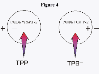 Figures 3 & 4. Accumulation of lipophilic ions is used to measure DY. If DY is interior negative, accumulation of lipophilic cations [tetraphenylphosphonium (TPP+), tetraphenylarsonium (TPA+) or methyltriphenylphosphonium (TPMP+)] is measured. If DY is interior positive, accumulation of lipophilic anions [tetraphenylborate (TPB-) or thiocyanate (SCN-)] is measured. The basic principle is that although charged species are generally membrane impermeant, this class of compounds is able to delocalize charge and also sufficiently hydrophobic to permeate the membrane rapidly, thereby allowing equilibration with DY. Lipophilic ions are synthesized in radioactive form and used in micromolar concentrations, since at high concentrations, DY collapses. Electrodes specific for TPP+ have also been developed in order to measure the free concentration of the lipophilic cation in the medium. In addition, fluorescent lipophilic ions are available that quench when they are concentrated internally. Subsequent to the development of lipophilic cations, it became possible to impale giant E. coli with microelectrodes and measure DY directly. The values obtained are close to those measured with TPP+. The lipophilic cation thalium is used for myocardial visualization. |