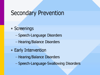 Secondary Prevention: A. Screenings and follow-up across the lifespan for 1. Auditory/Balance Disorders (universal newborn hearing screening, screening hearing, middle-ear function, and central auditory processing).2. Speech-Language Disorders a. Screening speech, language, voice, and oral mechanism and related behaviors.b . Educating parents about dysfluencies in preschool children, and the value of early intervention.B. Early Preventive Intervention, that is, using treatments targeting toward developmental issues such as early communication development. 1. Auditory/Balance Disorders(audiologic habilitation, amplification and assistive listening devices, vestibular rehabilitation) 2. Speech-Language Disorders (literacy, augmentative/alternative communication devices). Transition: As previously defined, tertiary prevention is an attempt to decrease the severity or impact of a disability associated with an existing disorder or disease…. |