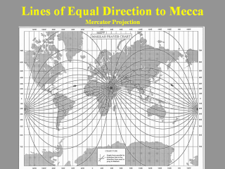 | This map, by Professor Jon Kimerling of Oregon State University at Corvallis, gives the direction to Mecca on a Mercator projection. From (Los Angeles) Santa Barbara the direction is approximately 22.5 (24) degrees East of North. |