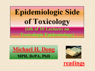 toxicologic side of epidemiology. Note that the distinction made in this and the last lecture between the two sides is more a gimmick of drawing the student’s attention, than a representation of the reality. For each of these six cases and others not discussed, there is some truth that one side might have initiated or dominated the historical events or undertaking, but that would be pretty much the extent of the distinction. The titles of the 10 lectures are: (1) Toxicology and Epidemiology; (2) Public Health and Risk Assessment; (3) Toxicology and Risk Assessment; (4) Epidemiology and Risk Assessment; (5) Toxicologic Side of Epidemiology; (6) Epidemiologic Side of Toxicology; (7) Human Exposure Assessment I; (8) Human Exposure Assessment II; (9) Characterization of Health Risk; and (10) Toxicologic Epidemiology. |