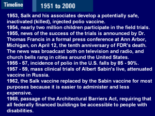 in U.S.; last case of smallpox in the world. 1980s, post-polio syndrome identified by physicians and people who had polio. 1980, the first National Immunization Day for polio held in Brazil. 1981, poliovirus genome sequence published. 1985, Rotary International launches PolioPlus program. 1988, Rotary International, PanAmerican Health Organization, World Health Organization, Centers for Disease Control, UNICEF begin international campaign to stop transmission of polio everywhere in the world. 1990, Passage of the Americans with Disabilitites Act (ADA), providing broad legal protections for people with disabilities. 1999, inactivated polio vaccine replaces oral polio vaccince as recommended method of polio immunization in the United States. |
