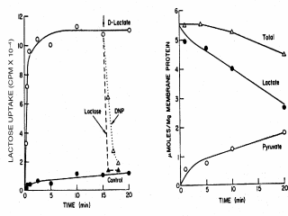 ∆) causes rapid release of accumulated radiolabeled lactose (Left).