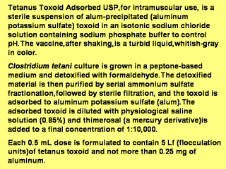 | The residual formaldehyde content,by assay,is less than 0.02%.The tetanus toxoid induces at least 2 units of antitoxin per mL in the guinea pig potency test. |