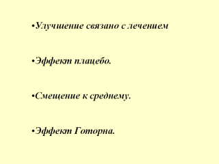 Эффект Готорна - обусловлен тем, что люди, находясь под наблюдением, меняют своё поведение, независимо от того получают они лечение или нет.