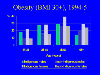 Indigenous adults are more likely than non-Indigenous adults to be classified as obese, based on their measured height and weight. The difference is more pronounced among those less than 45 years old than among older adults. Data for Indigenous adults is from the 1994 National Aboriginal and Torres Strait Islander Survey. Data for non-Indigenous adults is from the 1995 National Nutrition Survey, which consisted of a sub-sample of respondents from the 1995 National Health Survey. No measurements of height or weight were taken in the National Health Survey, and self-reports were found to under-estimate body mass index among those measured in the National Nutrition Survey. The figures in the graph show body mass index based on actual measurements of height and weight, rather than on self-report. For more information about overweight and obesity among Indigenous Australians, see Cunningham J & Mackerras D, 1998, Occasional Paper: Overweight and Obesity, Indigenous Australians, 1994. ABS cat. no. 4702.0, Australian Bureau of Statistics, Canberra. Available on-line at http://www.abs.gov.au/Ausstats/ ABS%40.nsf/525a1b940214123 5ca25682000146abc/0160129f31 7b8611ca2568890020a6f1!Open Document BMI Body mass index