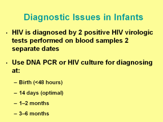 antibodies; therefore a virologic test should be utilized [10]. A positive virologic test (i.e., detection of HIV by culture, DNA polymerase chain reaction [PCR] or RNA assays) indicates possible HIV infection and should be confirmed by a repeat virologic test on a second specimen as soon as possible after the results of the first test become available. Diagnostic testing should be performed before the infant is age 48 hours, at age 1–2 months, and at age 3–6 months. Additional testing at age 14 days might allow for early detection of infection. HIV infection is diagnosed by two positive HIV virologic tests performed on separate blood samples, regardless of age. HIV DNA PCR is the preferred virologic method for diagnosing HIV infection during infancy. A meta-analysis of published data from 271 infected children indicated that HIV DNA PCR was sensitive for the diagnosis of HIV infection during the neonatal period. Thirty-eight percent (90% confidence interval [CI] = 29%–46%) of infected children had positive HIV DNA PCR tests by age 48 hours [17]. No substantial change in sensitivity during the first week of life was observed, but sensitivity increased rapidly during the second week, with 93% of infected children (90% CI = 76%–97%) testing positive by PCR by age 14 days. By age 28 days, HIV DNA PCR has 96% sensitivity and 99% specificity to identify HIV proviral DNA in peripheral blood mononuclear cells (PBMCs) [16]. |