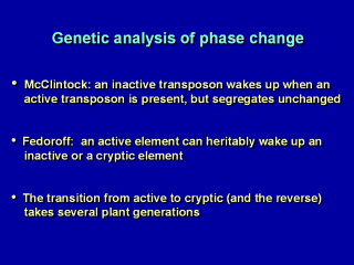 never seen in her cultures. And of course she succeeded. She invested a great deal of effort in studying the inactivation and reactivation of the Suppressor-mutator or Spm element. She understood that the Spm transposon could exist in a variety of heritable forms -- epimutants -- that differed in either the frequency, the timing, or the developmental pattern of transposon inactivation and reactivation. In one form, the transposon alternated between active and inactive phases at intervals of a few cell divisions, creating a somatic mosaic for transposon activity. The kernel in the photograph shows the effect of such a transposon on the activity of a gene in the anthocyanin biosynthetic pathway. When the transposon is on, the gene is off and vice versa. She identified other transposon epimutants which were active only in certain tissues or in certain parts of the plant, and still other epimutants that remain largely inactive, returning to an active form very occasionally. Then, in a brilliant series of genetic experiments, she deduced that an active transposon can communicate with an inactive transposon to reactivate it when the two are brought together by a genetic cross. We subsequently showed that the interaction also heritably alters the inactive element. Exposure to an active element promotes the reactivation of an inactive element. But the process takes several plant generations before an inactive element is fully and heritably activated. So McClintock not only discovered transposition, but also provided the first genetic evidence for the existence of an epigenetic modifier. |