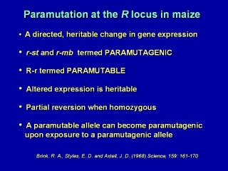 in the 1950s that violates this most fundamental of genetic laws. In R paramutation, one allele imposes a directed heritable change on the expression of another allele. The maize R locus, which we now know encodes transcription factors required for expression of anthocyanin biosynthetic genes, is subject to paramutation. Brink reported that the expression of a wild-type R-r allele decreased in the next generation after exposure to either an allele called r-st (or another such allele, called r-mb, which was later identified). The alleles that do the job are termed PARAMUTAGENIC, and those which change are called PARAMUTABLE. The alteration is heritable and can be maintained, but can also be gradually lost in certain genetic configurations. More than that, after exposure to the paramutagenic allele, the paramutable allele can itself become paramutagenic. |