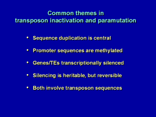 and paramutation is the following: 1. Silencing is associated with sequence duplication. In the case of transposons, this generally occurs as a consequence of transposition. 2. Promoter sequences become methylated preferentially. 3. Both transposons and R genes are transcriptionally silenced 4. Silencing is heritable, but reversible. When silenced TEs or R genes are reactivated, methylation decreases or disappears. 5. There is evidence of communication between homologous sequences located at different chromosomal sites. In the case of paramutation, the silenced locus can impose silencing on allelic loci, even when they are located elsewhere in the genome. In the case of TEs, a transcriptionally active transposon can activate an inactive one, leading to its heritable reactivation and demethylation. As I mentioned earlier, this is mediated by an element-encoded protein in the case of Spm. Another maize transposon, Mu, undergoes concerted methylation and inactivation of copies throughout the genome. 6. Finally, both involve transposon sequences. In the case of the paramutable R locus, a transposon sequence is integral to the promoter. The difficulty in interpreting this observation is that the deletion simultaneously removes the promoter sequences and the transposon sequences, so it cannot be ascertained whether paramutability and the ability to become paramutagenic requires the transposon sequences or transcription of these genes -- or both. |