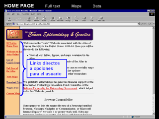 | La página de inicio del “Atlas On-Line” tiene links al texto completo del Atlas, también a las tablas de mapas y datos que pueden ser cargados, y al sitio Web de los “mapas a la medida”. |