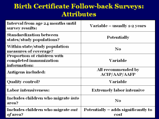 This table summarizes the attributes of birth certificate follow-back surveys.