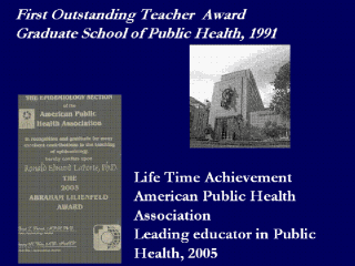 | Dr. LaPorte is very pleased to be nominated for the Universities teaching award. In 1991 he received the first Outstanding Teaching award for the Graduate School of Public Health. In 2005 he received the most prestigious lifetime achievement teaching award from the American Public Health Association, only one of which is given world wide. |