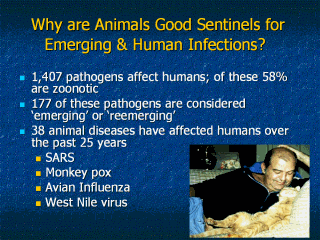 animals. · A zoonotic disease is one that is naturally transmissible from animals to people. · Zoonotic diseases occur where people live in close proximity with food animals such as poultry in developing countries (avian influenza), consume wild animals such as Civet cats (SARS), own exotic pets such as prairie dogs (monkey pox), or simply covet dogs and cats as pets (toxocariasis) · It is the veterinarian’s responsibility to identify zoonotic diseases in their patients before they can spread to humans |