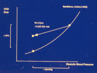 In terms of reversibility, the meta-analysis of treatment intervention studies by McMahon and Collins suggests that, of the 25% increase in coronary heart disease risk consequent upon 6mmHg rise in diastolic blood pressure, around 14% of this is reversed by anti-hypertensive therapy lowering usual diastolic blood pressure by the same amount. More recent meta-analyses have increased this benefit to around 17%.