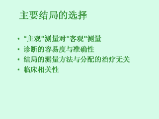 结局是首选的,这方面的例子包括死亡(或生存)、疾病缓解、血压改变等等。更加“主观”一些的测量结果,例如疼痛减轻、生活质量、心理状态等一类的结局可能是同样重要的,但更容易在病人或观察者知道(或认为他知道)病人接受了哪种治疗时引入偏倚。主要结局应是与临床有关联的,例如,尽管血脂肪在一项为降脂药进行的试验中是客观且易于测量的结局,若没有相伴随的心脏病或死亡的风险的改变,则它对于病人或临床医生可能几乎没有什么意义。