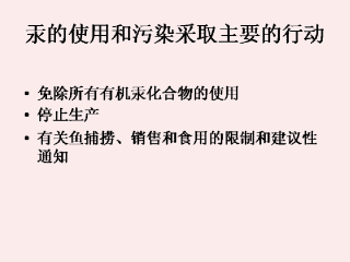 所有汞的工业使用者应该被要求将汞的排放降低到正常水平。WHO已经就烷基汞拌种中的使用提出了警告(WHO,1976)。