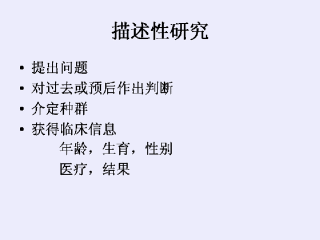 我们设计一个描述性的研究来描述绞痛病例的特征。我们需要遵照几个步骤:提出问题,介定种群,获得医疗记录,收集和总结数据,推断结果。