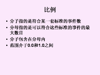 比例也是发病率和致死率的有力度量工具。它与比率和比值相比还是有很多的不同点。在比例中,分子指符合某一标准的事件数,跟比值很相似。然而,它的分母指的是可以符合这些标准的最大事件数。像比率一样,比例的分子和分母也具有相关性。通过定义可以看出,比例介于0.0和1.0之间。比例的计算通式见下页。