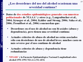| Muchos investigadores contemporáneos han cuestionado la diferenciación arbitraria entre las categorías de abuso y dependencia al alcohol de DSM-IV. La determinación de si los síntomas de abuso y dependencia representan distintas dimensiones, o están relacionadas en la misma dimensión, será importante trabajar en el futuro trabajar en esta área. Además, algunos estudios han sugerido que el abuso del alcohol no es un prodrómico o precursor de la dependencia al alcohol. |