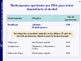 | Por muchos años el tratamiento del alcoholismo se basó en casi exclusivamente terapia conductual, se están haciendo esfuerzos, expandiéndose en los años recientes, para desarrollar medicamentos para desordenes del uso del alcohol. Tres agentes están aprobados por su uso en EUA y muchos otros países. Como sucede con medicamentos para enfermedades crónicas estos medicamentos han sido encontrados muy efectivos con algunos pacientes pero en otros no han respondido a ellos. |
