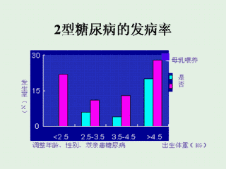 and Barker 教授发现的一致。然而,高出生体重儿糖尿病的发病率增高主要由于妊娠时糖尿病的作用,产生巨大儿。不管出生体重,母乳喂养的婴儿后来糖尿病的发病率低。机制不明确,在5年中人工喂养的发病率高于母乳喂养。