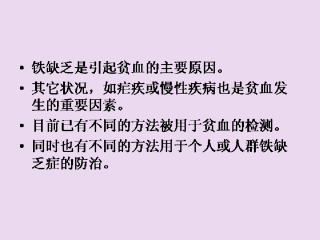 虽然铁缺乏是引起贫血的主要原因,但是其它情况如疟疾或慢性疾病在贫血的发生过程中也发挥着一定作用。由铁缺乏引起的贫血代表了不同生理改变的终点,因此为了理解缺铁性贫血,有必要对铁的生理和代谢进行探讨。目前已有多种方法应用于IDA的检测,这是本演讲讨论的内容,同时在演讲中还要对个体和人群IDA的预防和治疗方法年年个探讨。最后,建议阅读一些文献以拓展今天演讲中讨论的主题。