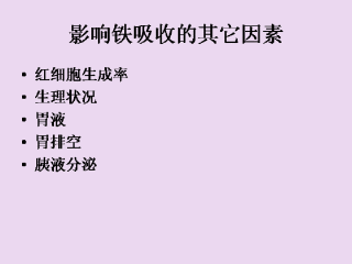胃排空:铁在盐酸的作用下从食物中释放出来,因此食物在胃中停留的时间越长,铁吸收的量越多。
