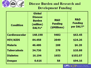 2006: *Disability-Adjusted Life Year. DCPP estimates in millions are: cardiovascular = 208.8; HIV = 71.5; malaria = 40.0; tuberculosis = 36.1; Diabetes = 20.0; dengue = 0.5 |