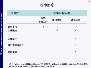 历史上,专业的心理研究者首先致力于构建解释改变以及干预结果的理论框架。这个理论框架包括认知行为,12步和动机强化。后来的研究主要包括:通过改变治疗的方法、训练和管理,来完善框架的有效性;发展和使用有效可靠的工具;改进研究设计,例如随机对照试验。结果出乎意料:不同理念框架和不同干预手段下的治疗产生近似(且相当好)的结果(例如:戒除或者显著降低饮酒及其后果)。更重要的是,相对而言短的、温和的治疗结果和加强性治疗结果相同。这些结果显示非特异性因素(如:寻求帮助,建立希望,治疗的依从性)可能比理论模型中预测的治疗特异性因子更重要。