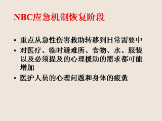 在灾后恢复阶段,灾害应急反应主要职能发生转变,从对灾害中急性伤害的救助转到普通人群的日常医疗需要中。灾后集中的人群对医疗、临时避难所、食物、水、服装以及必须提及的心理援助的需求都可能增加。医院也必须应对医务人员的疲劳和心理压力。