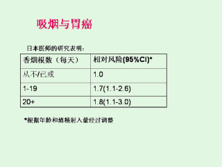 预期的研究一贯指出吸烟者中胃癌得病风险最多可增加两倍,但是未必能找出剂量对应关系。