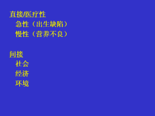 在婴儿死亡率1/2中我们列举了不同的婴儿致死原因,包括直接(急性和慢性的医疗性原因)以及间接(社会,经济,环境原因)。