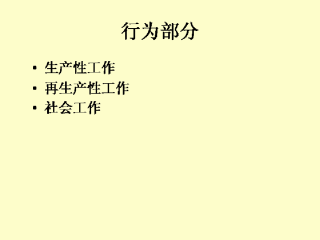行为部分试着去区分各种种类的工作,包括谁做着工作和做这些工作需要消耗的时间。