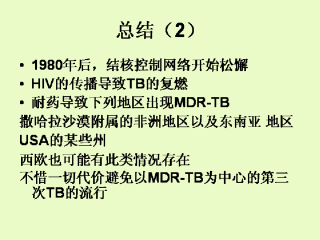 认为TB差不多被消灭了,工业化国家开始极大地松懈他们的TB控制网络。几乎同时出现地HIV地流行,使得TB地感染情况更为糟糕。TB又开始出现,而且耐药地增加导致了MDR-TB的出现