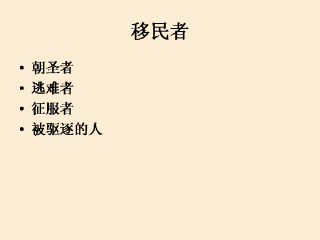 描述从一个地方迁移到另外一个新环境的移民者的词语有朝圣者、逃难者、征服者和被驱逐的人。70%的美国人都移民者,所以可以说,美国是一个移民国家。我们在美国进行移民研究以及环境因素对疾病的影响的研究非常有便利,因为在20世纪美国有大量的移民。