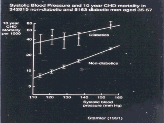 in non-diabetic subjects. There are two things which are pointing out: a). The access risk of diabetes is nothing to do with blood pressure (somebody with 120 systolic blood pressure has 4 times higher risk in mortality if he has diabetes). So, the diabetes is the independent risk factor. b). I want to contrast the relative risk increase with blood pressure in diabetes and absolute risk increase. |