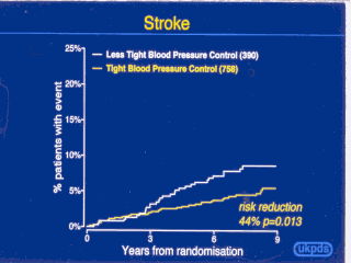 | We revealed much more positive effect of blood pressure on stroke (with 44% of reduction in the tight pressure control group) and on to heart failure ( it was 56% reduction). There were also significant benefits in trends of prevention of microvascular disease in tight blood pressure control. |