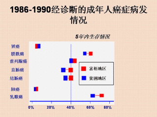 这反映了最常见癌症在最富裕和最贫困地区生存状况的差异;除了胃癌,所有这些常见癌症在富裕地区的康复状况明显要好于贫困地区的。至于胃癌的康复状况,在两种地区没有明显的差异。