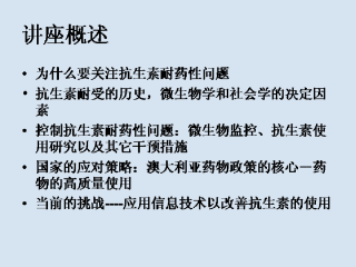 演讲的第一部分将会首先回顾以下抗生素耐药性的历史,接着列举出当就前澳大利亚和其它国家的相关数据以及讨论耐药性问题发展下去所带来的后果和加剧这一问题严重性的社会因素,最后讨论一下如何缓解耐药性问题