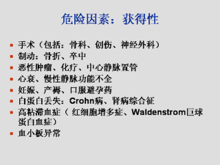 获得性危险因素可能比先天性危险因素更为常见。然而,当先天性危险因素与获得性危险因素同时存在时,发生VTE的危险性很可能是最大的。