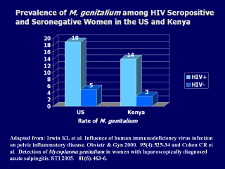 Africa, and HIV and M. genitalium co-infection is common. As you can see in this slide, in PID populations in both the U.S. and Kenya, endometrial M. genitalium is much more common among HIV seropositive women as compared to HIV seronegative women. Whether or not HIV infection affects susceptibility to M genitalium infection and disease, or whether it serves as a marker for high risk exposure will require further investigation. It is certainly possible that HIV might increase the susceptibility for M. genitalium infection. Thus, they may be at greater risk of mycoplasmal PID. This is important to consider in the context of global reproductive health, given the high rates of HIV in sub-Saharan Africa. |