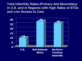| Compared to the U.S., you can see that both Sub-saharan Africa and also the northern territory of Australia have extemely high rates of total infertility, when both primary and secondary infertility are considered together. |